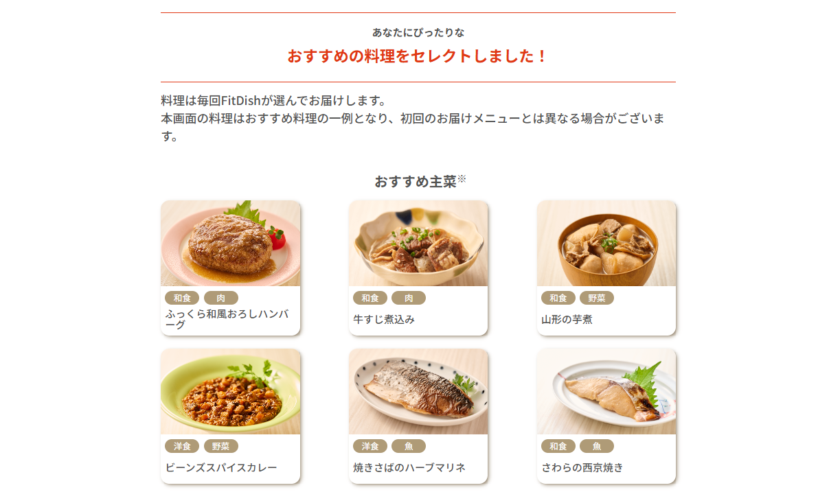 FitDishは、「おまかせ診断」で自分好みの主菜と副菜をお届けする、冷蔵パウチ型の宅配サービスです。